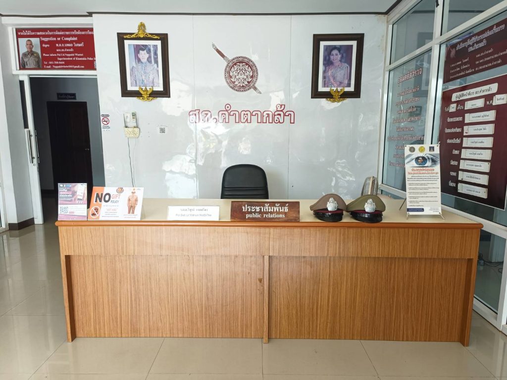 ติดไว้ในจุด บริการของสถานี เพื่อให้ประชาชนทราบว่า หน่วยงานประกาศว่าเจ้าหน้าที่ทุกคนในสังกัดไม่รับของขวัญหรือของกำนัลจากการปฏิบัติหน้าที่ และต่อต้านการรับสินบน โดย มี พ.ต.อ.นพดล วิเศษศรี ผกก.สภ.คำตากล้า หัวหน้าหน่วยงานประกาศ